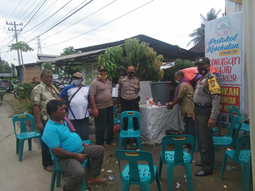 Bersama Kepala Desa Sudirejo, Suroso, Bhabinkamtibmas menegur warga yang tidak memakai masker dan menjaga jarak.