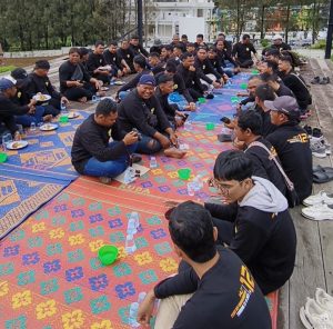 Usai berjoget, makan siang pun digelar dengan sederhana namun penuh kekeluargaan. Pimpinan PT Key Key terlihat duduk sejajar dan makan bersama karyawan.