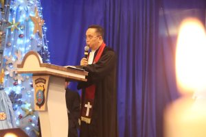 Ibadah Natal yang dipimpin Pendeta Yunus Bangun, MTh (Sekretaris Moderamen) didampingi Pendeta Edward Purba, MTh, menyampaikan pesan Natal tentang kehadiran Tuhan Allah dalam kehidupan keluarga serta panggilan untuk melayani dengan kasih, ketulusan dan pengorbanan.