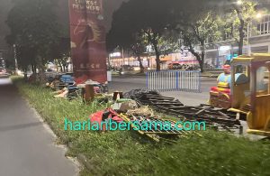 Akses jalan di sana ditutup sepihak terduga oleh suruhan pengusaha pasar malam. Sejumlah truk pengangkut peralatan terlihat parkir dan sebahagian alat sudah diturunkan di badan jalan. Bahkan tenda juga didirikan di atas jalan.
